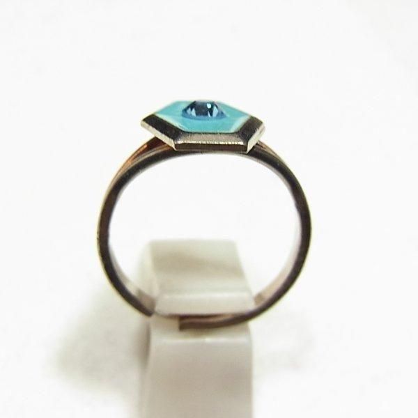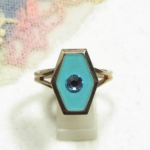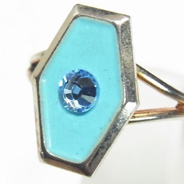 ●水色のエナメルの六角形のリング 水色のラインストーン