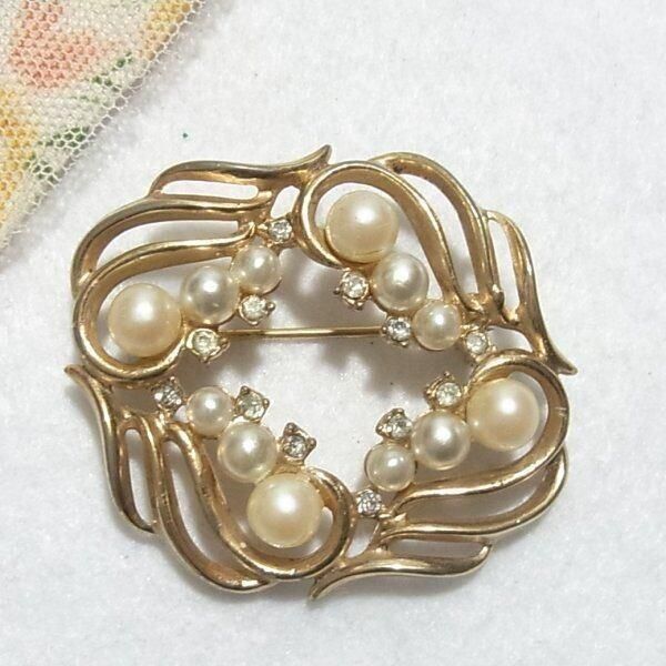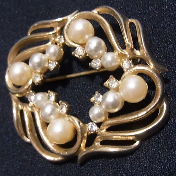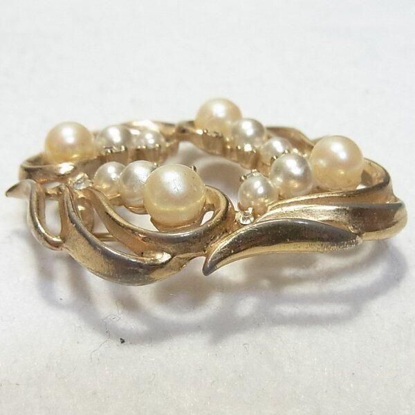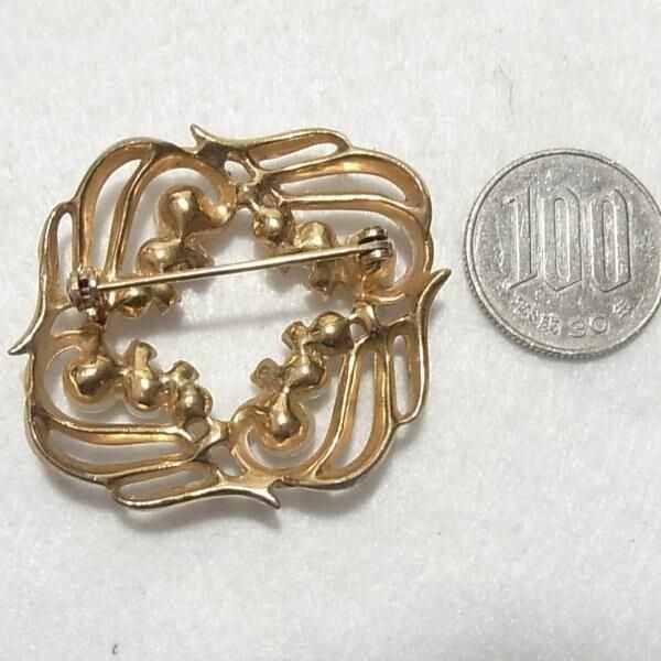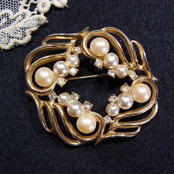 ヴィンテージ ゴールドトーンメタルに模造パールのブローチ 1960−70s E4781B