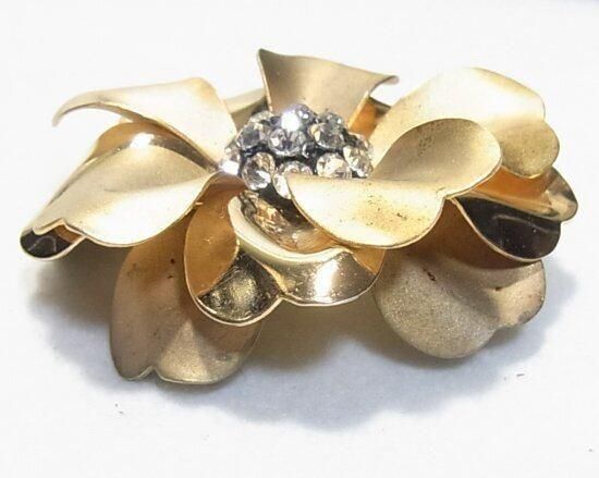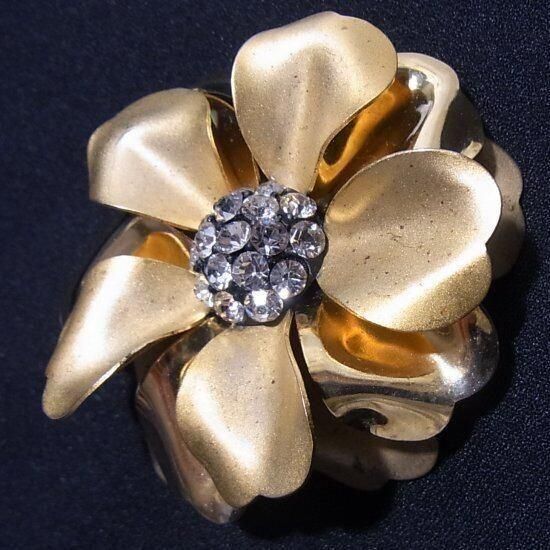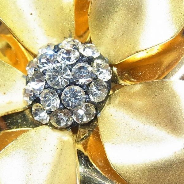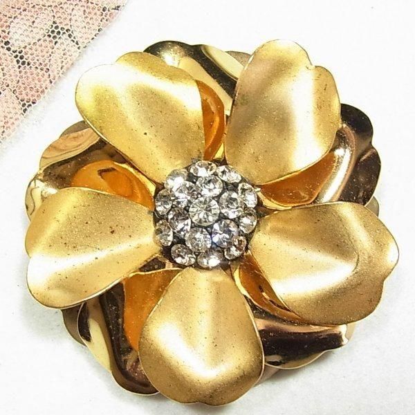 ●ゴールドトーンの大ぶりフラワーブローチ きれいに輝くクリアなラインストーン